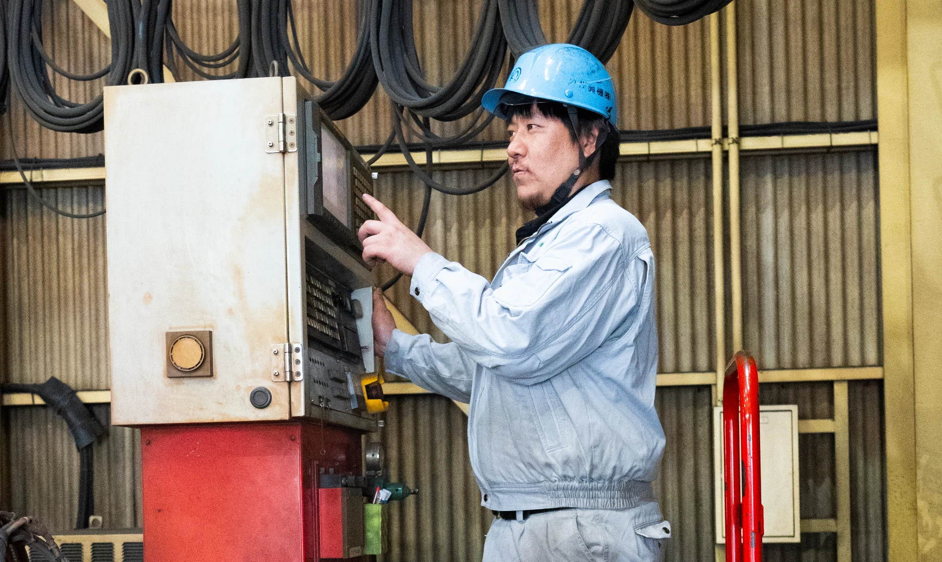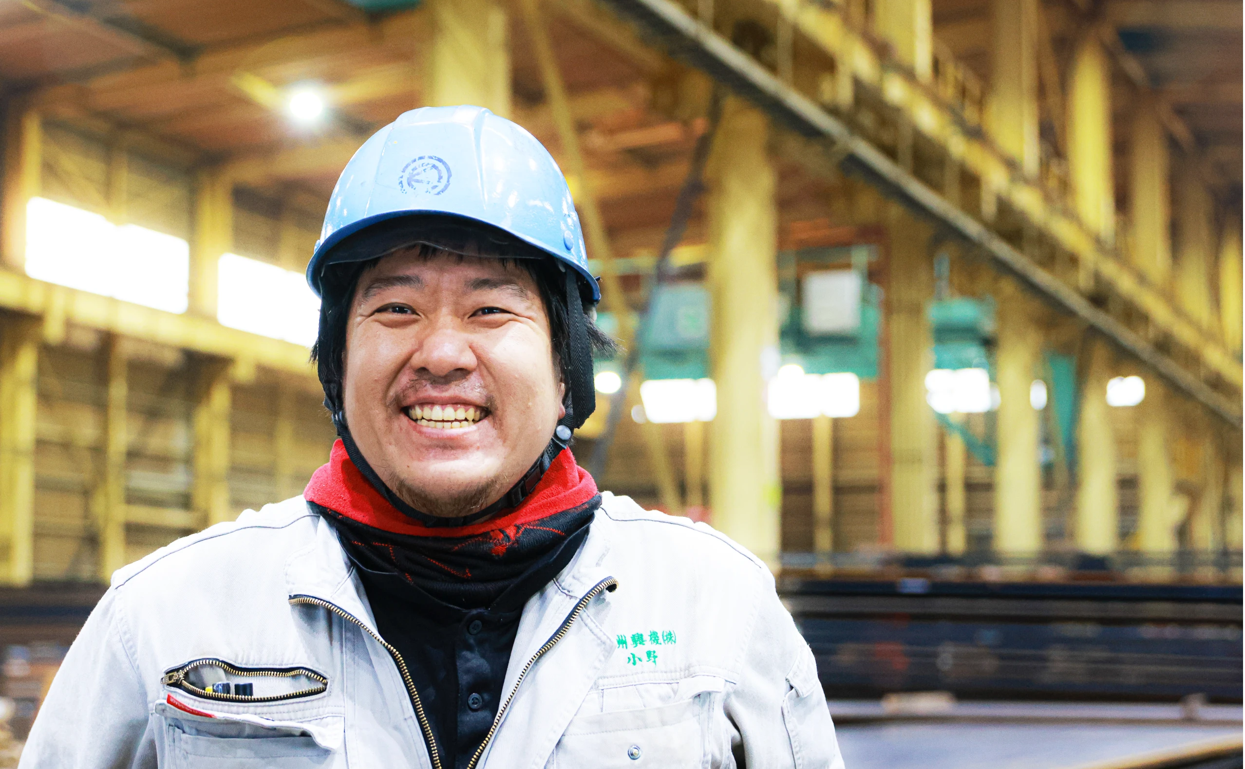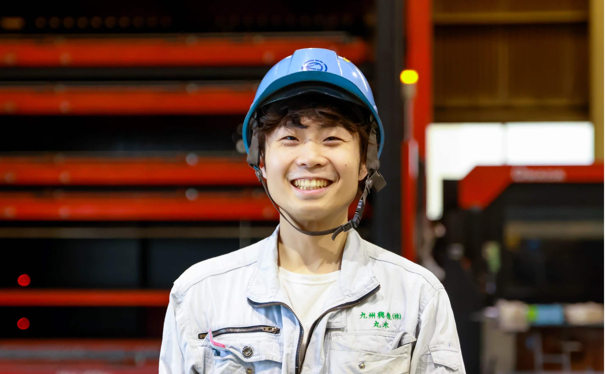 九州興機には福利厚生の良さと“鉄を扱うこと”への興味から入社しました。当初は仕事の段取りをつかめずに苦労しましたが、工場長や仲間の支えもあり、2年目くらいから「先を読む力」がつき、段取りよく仕事ができるようになりました。それからはいろいろなことに挑戦させてもらえています。実は前職はライン作業で、毎日同じことの繰り返しで仕事にやりがいを見いだせずにいました。でも今は一日一日が違うから、本当に毎日が楽しい。やりがいしかないですね。