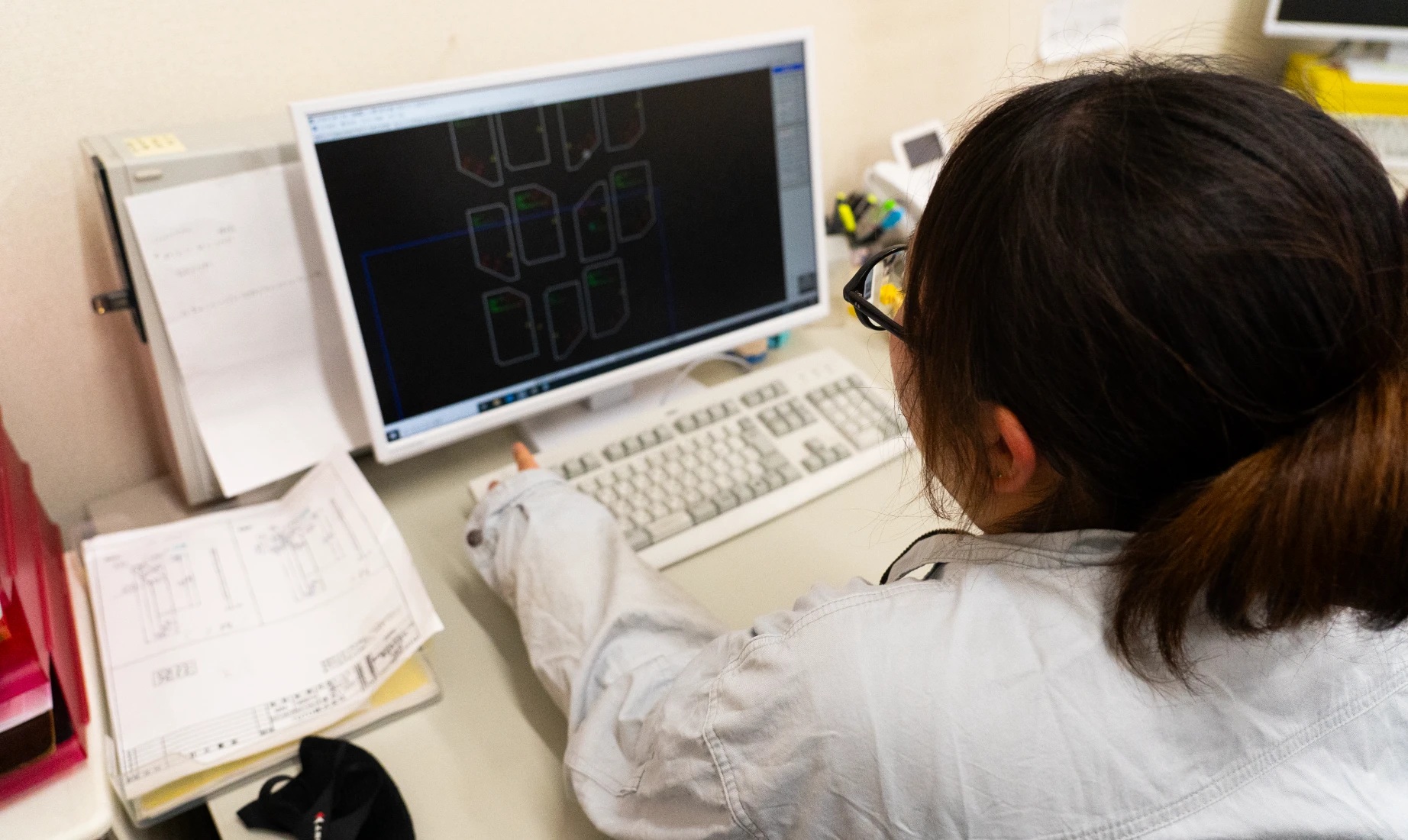デスクワークより現場が好きで、勤続年数の長い人が多いところにも惹かれて九州興機を選びました。金属加工というと力仕事が多く「男性の現場」というイメージがあり、その中で私が役に立てるのか不安でした。でもここに来てみると、金属加工の世界は単に力仕事だけではないことを知りました。CADという設計業務に関わることで、商品の設計から製造までのプロセス全体を理解し、自身の専門性を深めることができています。デスクワークは苦手でしたが、現場と密接につながる設計業務はとても楽しく取り組め、自分の視野を大いに広げてくれています。